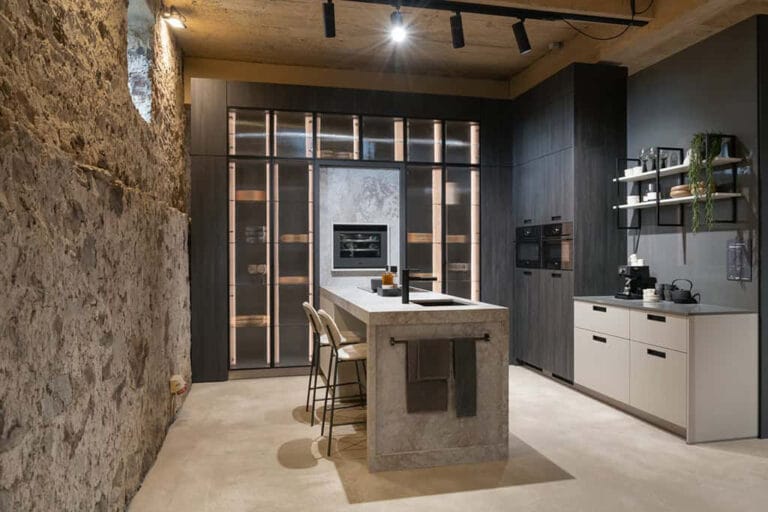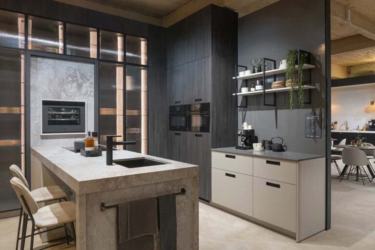 De industriële keuken viel op meerdere vlakken op: fraaie glasdeuren, een wijnklimaatkast ingebouwd in een achterwand en een stollenwand met een verdiept gedeelte. Die opvallende details werd kracht bijgezet door het materiaal waarvan het werkblad was gemaakt; Excava. Deze kleur van Caesarstone is een uitgesproken betonlook met grijze en taupe-kleurige structuren op een beige ondergrond. In de koffiecorner pasten we als donkere tegenhanger de kleur Raindream toe; een van de vier nieuwe kleuren uit de eerder genoemde Pebbles-collectie van Caesarstone.