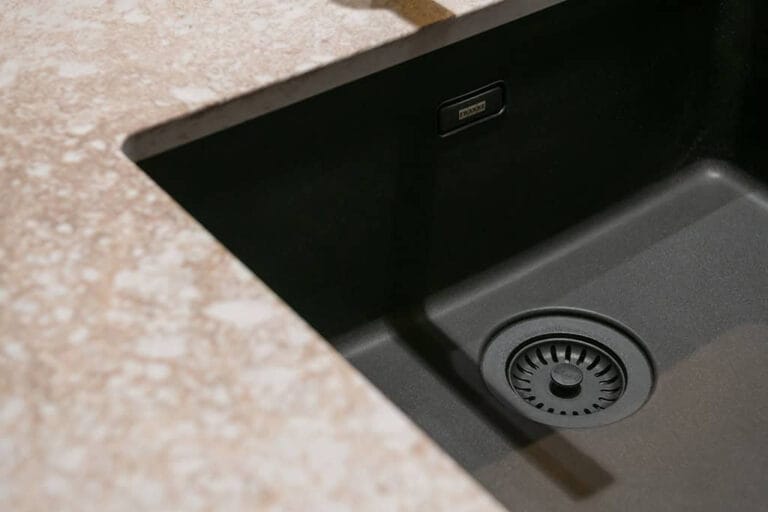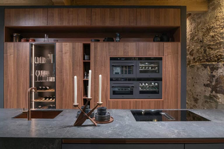 Een van de eyecatchers was absoluut de klassieke keuken. Het werkblad en de zeer vakkundig geproduceerde spoelbak werden uitgevoerd in Coastal Grey gepolijst, wederom een kleur van Caesarstone. Het materiaal heeft een warmgrijze basiskleur met natuurlijke aders in zwart, lichtgrijs en koper, die een erg stijlvolle match vormden met de keuken in matzwart en pecan bruin.