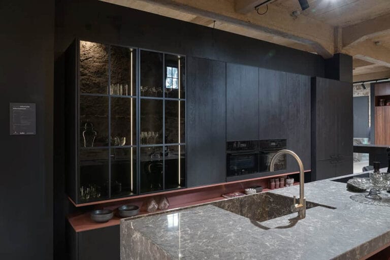 Op een moderne keuken in marineblauw en walnoot, toonden we de nieuwe kleur Darcrest satin van Caesarstone. Dit mysterieuze materiaal combineert donkere aardse tinten met nuances van geoxideerd metaal. Zo ontstaat een kleurenpalet van zwart-, antraciet-, koper- en grijstinten in een weelderige ton-sur-ton structuur. Op Gut Böckel werd het nieuwe materiaal fraai gecombineerd met een spoelbak en kraan in Copper Rose van Reginox.