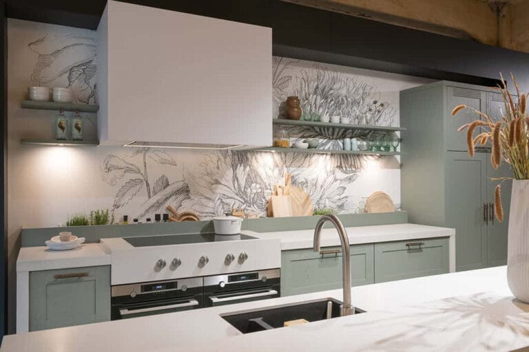 De landelijke keuken was een frisse combinatie van groen en offwhite. Voor de werkbladen combineerden we een kleur uit onze huidige collectie (Organic White), met een kleur uit de nieuwe Pebbles-collectie van Caesarstone, de Stoneburst satin.