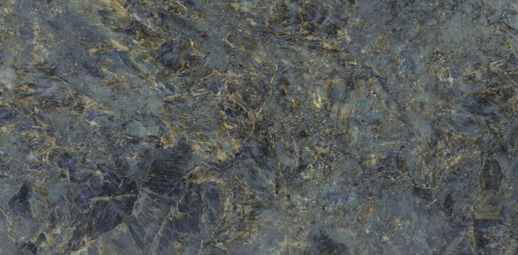 In dit uitgesproken materiaal is een blauw/groene ondergrond de basis voor gouden en groene structuren.