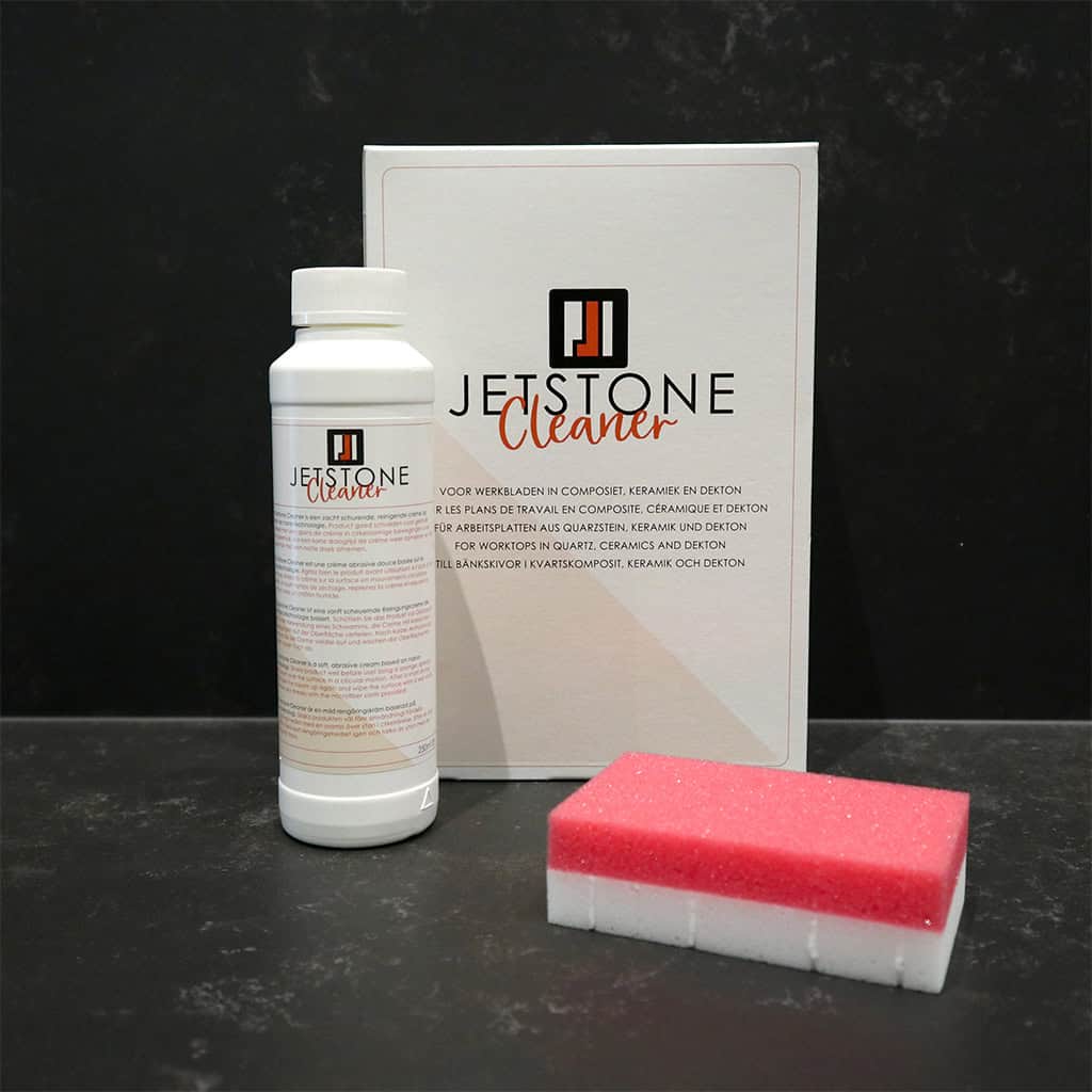 Jetstone Cleaner (250ml) inclusief een sponsje en onderhoudsfolder. Uw werkblad in composiet, keramiek of Dekton blijft hiermee in perfecte conditie.